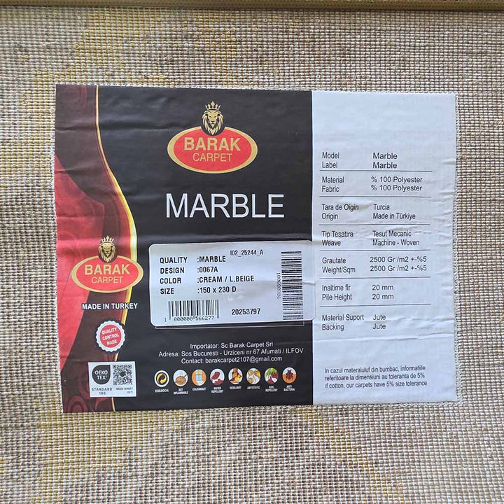 Bine ați venit în universul covoarelor din Colecția Marble, unde vă întâmpină un covor de interior excepțional ce aduce confort suprem și estetică impecabilă în orice încăpere. Compoziția sa, realizată din 100% poliester, conferă o senzație plăcută la atingere și la pas, oferind o serie de proprietăți avansate și benefice atât pentru dumneavoastră, cât și pentru locuința dumneavoastră.
