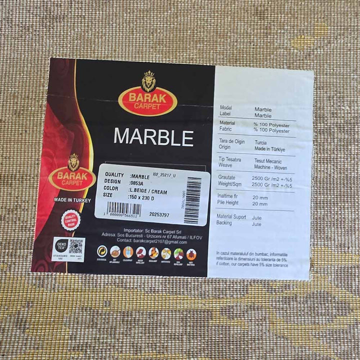 Bine ați venit în universul covoarelor din Colecția Marble, unde vă întâmpină un covor de interior excepțional ce aduce confort suprem și estetică impecabilă în orice încăpere. Compoziția sa, realizată din 100% poliester, conferă o senzație plăcută la atingere și la pas, oferind o serie de proprietăți avansate și benefice atât pentru dumneavoastră, cât și pentru locuința dumneavoastră.