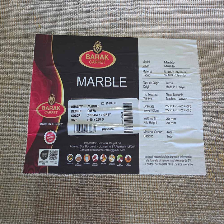 Bine ați venit în universul covoarelor din Colecția Marble, unde vă întâmpină un covor de interior excepțional ce aduce confort suprem și estetică impecabilă în orice încăpere. Compoziția sa, realizată din 100% poliester, conferă o senzație plăcută la atingere și la pas, oferind o serie de proprietăți avansate și benefice atât pentru dumneavoastră, cât și pentru locuința dumneavoastră.
